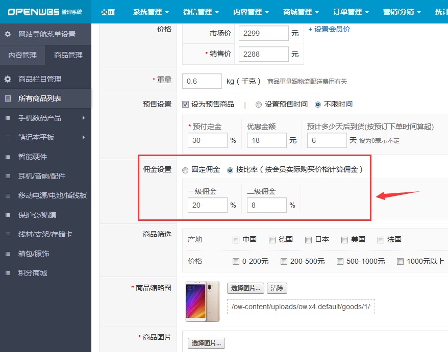 考慮到微信封殺三級分銷原因,商城系統設置里可以自由選擇設置是一級還是二級分銷。
