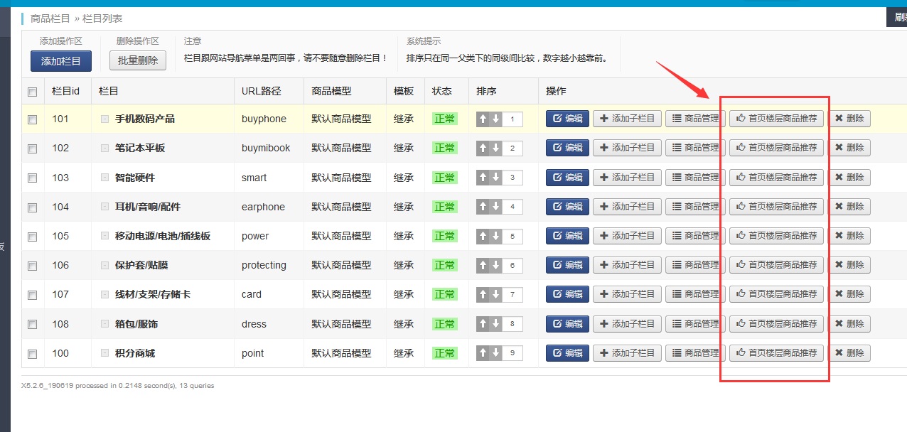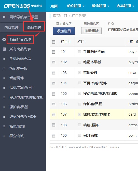 首先進入后臺,左側管理面板:商品管理>商品欄目管理,進入商品欄目管理頁面。